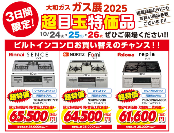 感謝還元セール2025 ガス展ご来場のお礼 ※掲載の写真・イラストはイメージです。 ガス展会場案内 ※画像をクリックすると拡大してご覧いただけます。 ※イベントの内容等は、都合により変更または中止になる場合がございますので、ご了承ください。 ※お時間帯によっては混雑する場合がございますのでご了承ください。 ※掲載の写真・イラストはイメージです。 超目玉特価品